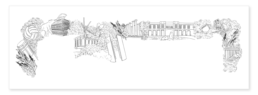 Using icons and landmarks from across campus I illustrated a design to relay the feeling of being a member of the UNL community. I worked a scratchy graphite texture into my linework for a sketchbook appearance and had the illustration extend out from behind the digital screens already present on the wall. Representative of the growth and reach the campus has experienced and will continue to experience; I left the edges of the design free forming and adaptable.