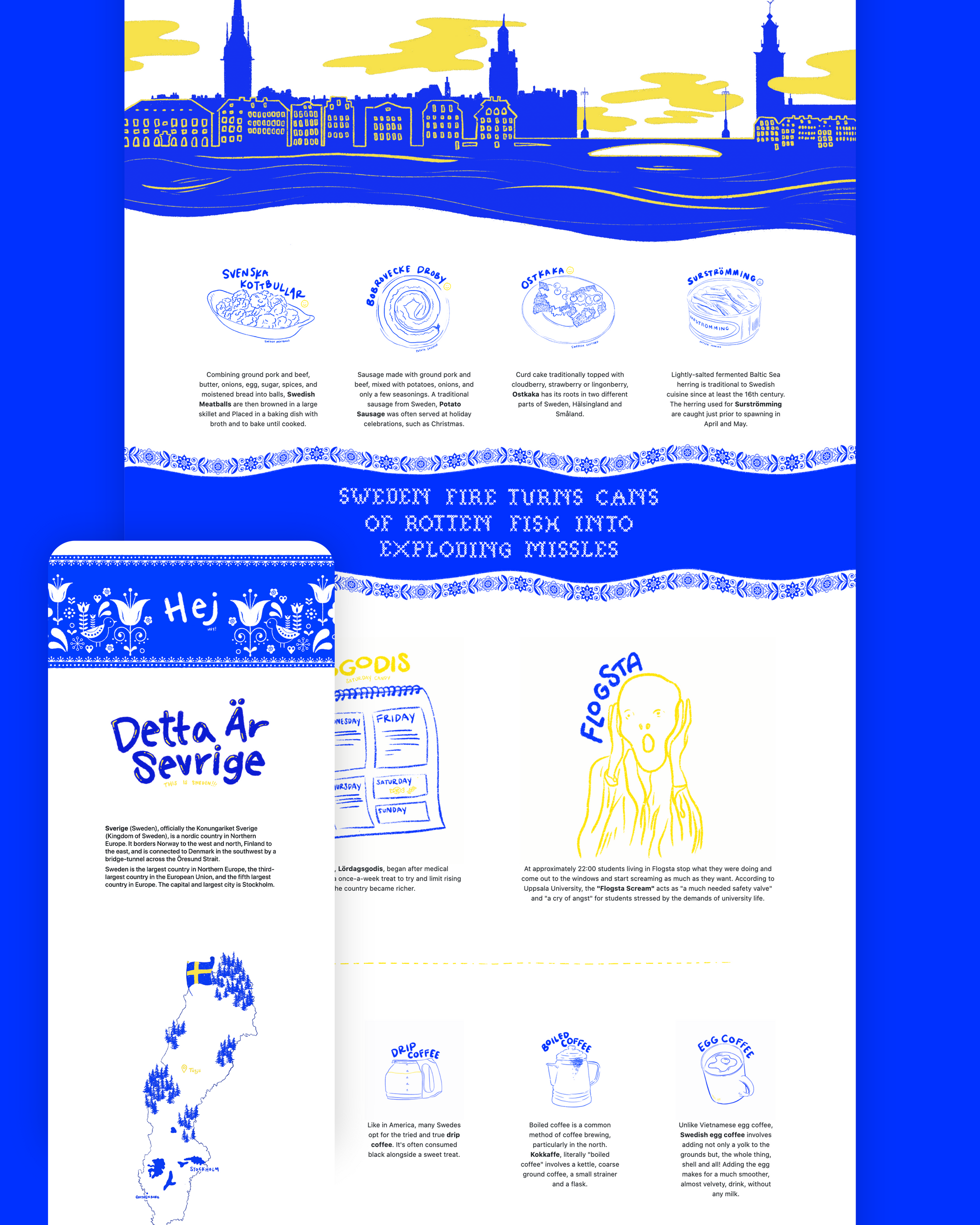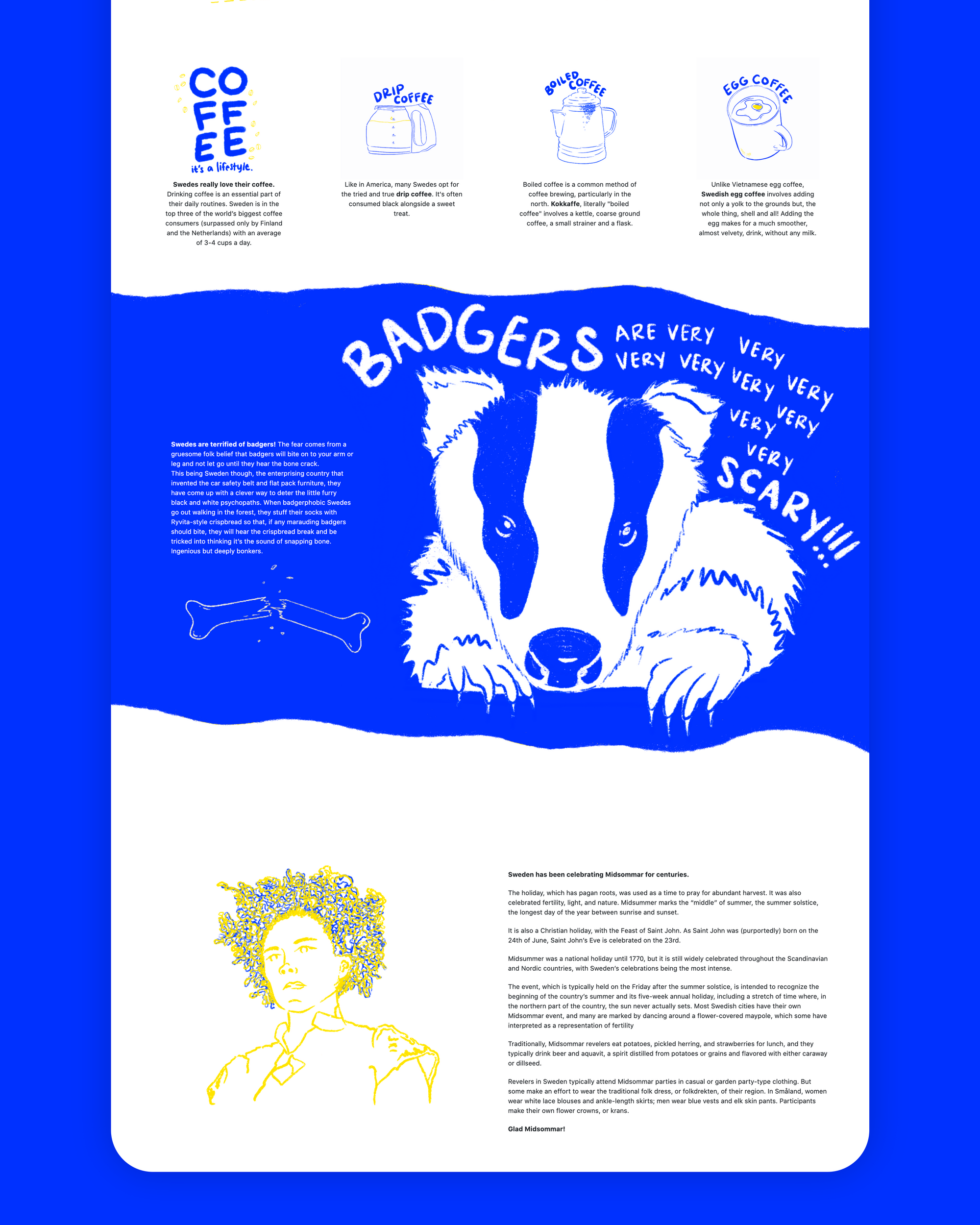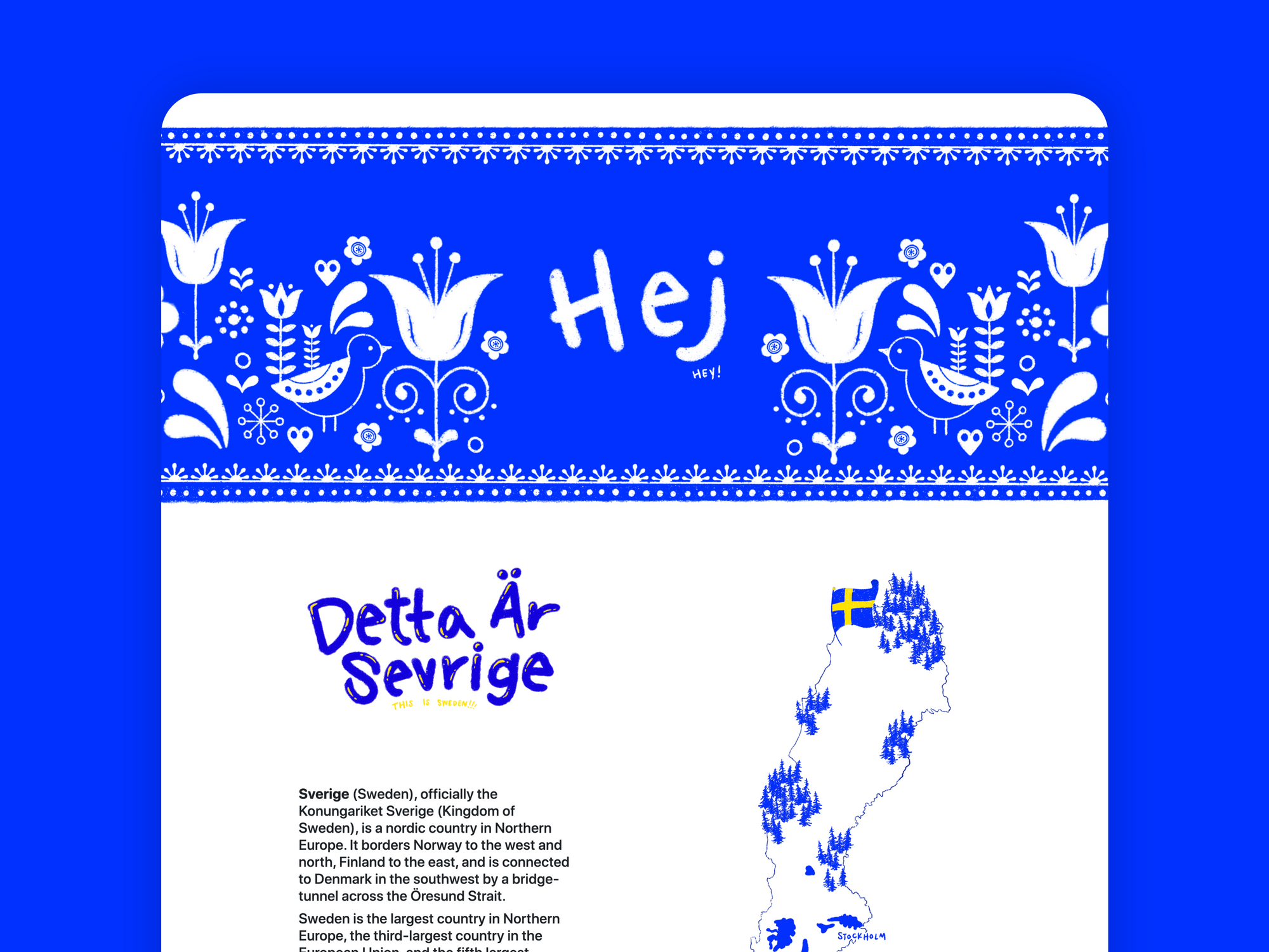 A simple coding project about Swedish culture inspired by traditional stitchings, tales and customs that utilized bootstrap and custom CSS. Small animations were scattered throughout the landing page for movement.