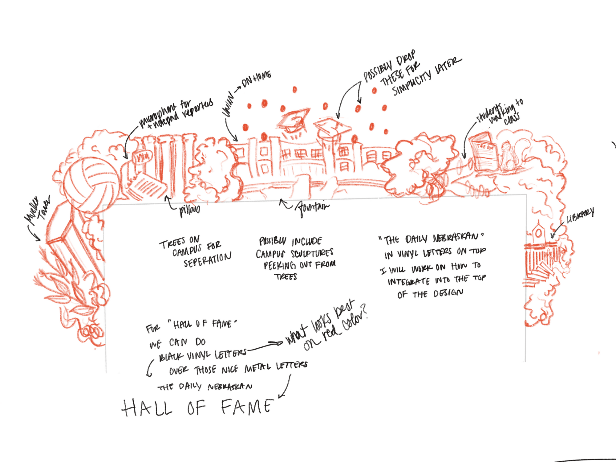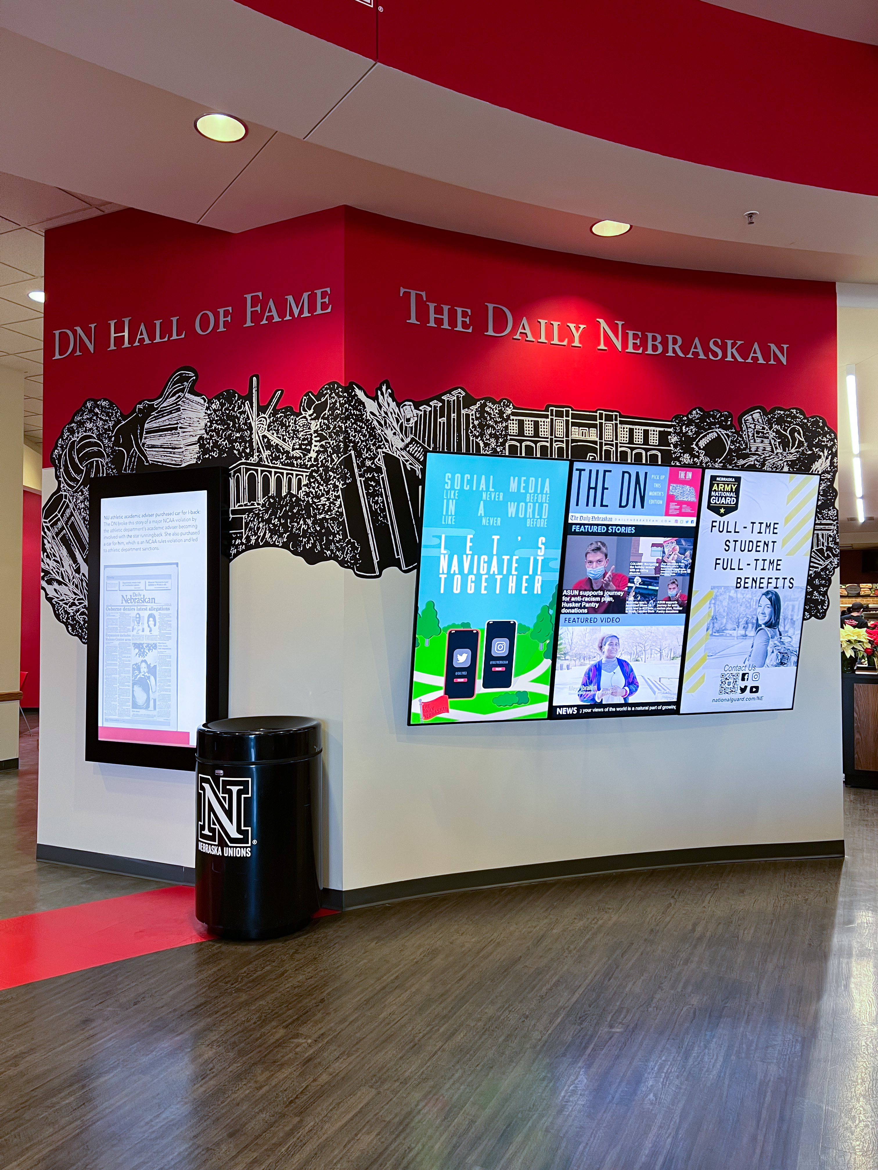 The Daily Nebraskan, a student run newspaper and pillar of the University of Nebraska-Lincoln’s community established a Hall of Fame display wall located in the student union on city campus. Around the display the DN needed a mural design that fit their traditions and values.