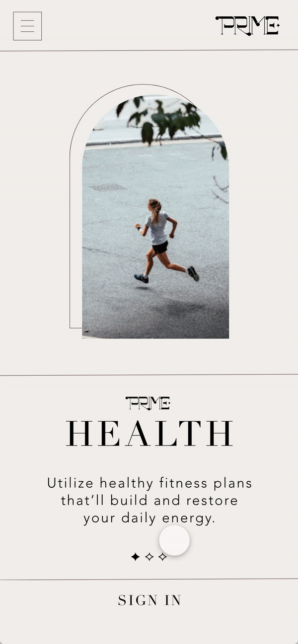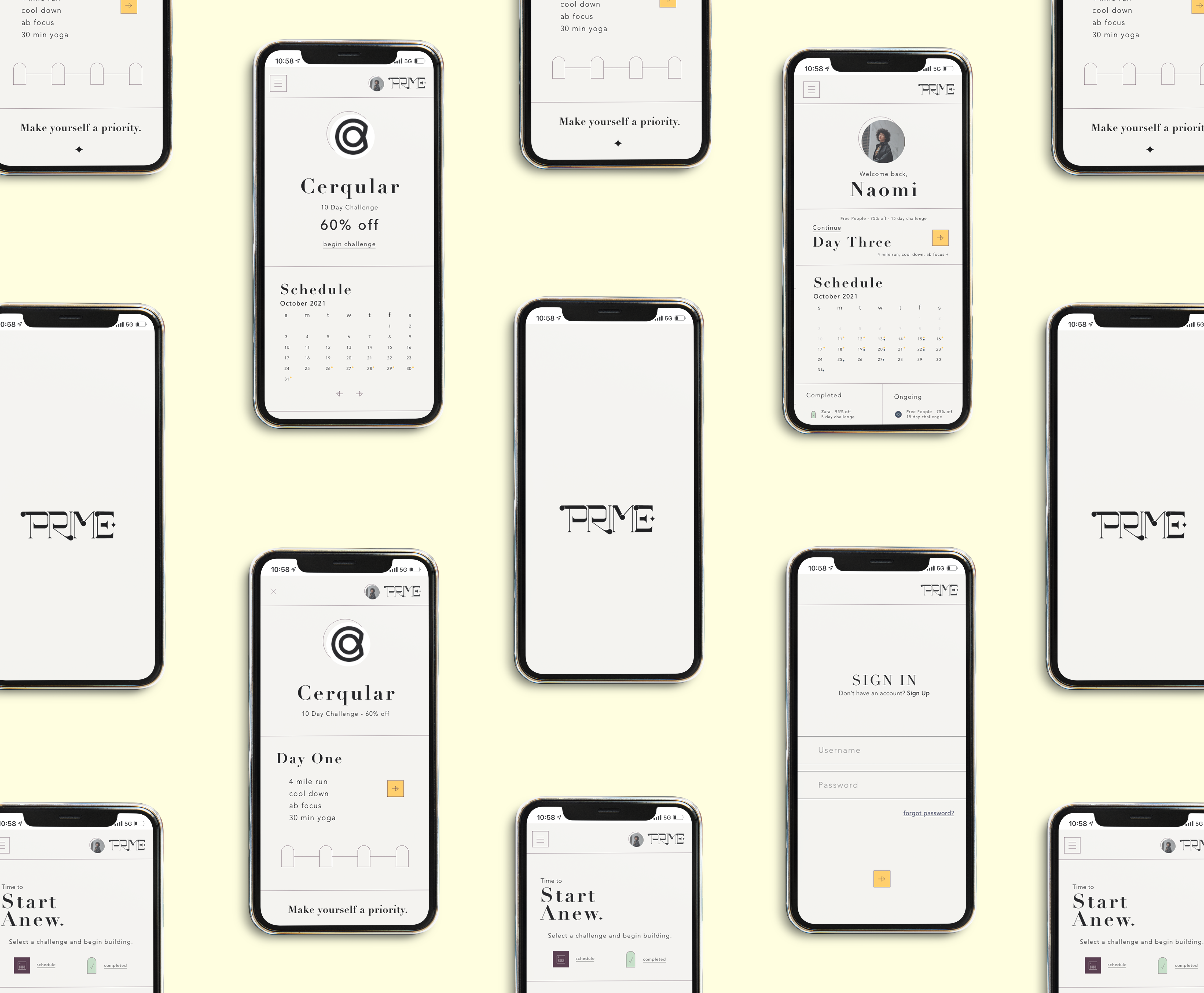 Keeping to a clean and neutral tone base on the app, I wanted the design to reflect the mid-to-high fashion minimalist brand influencer who is also dedicated to sustainability and all-over wellness. Through the app’s three benefits: prime health, prime value and prime quality I was able to build a simple design aesthetic with a focus on results. These benefits are highlighted throughout the design with coordinating color schemes and shapes.