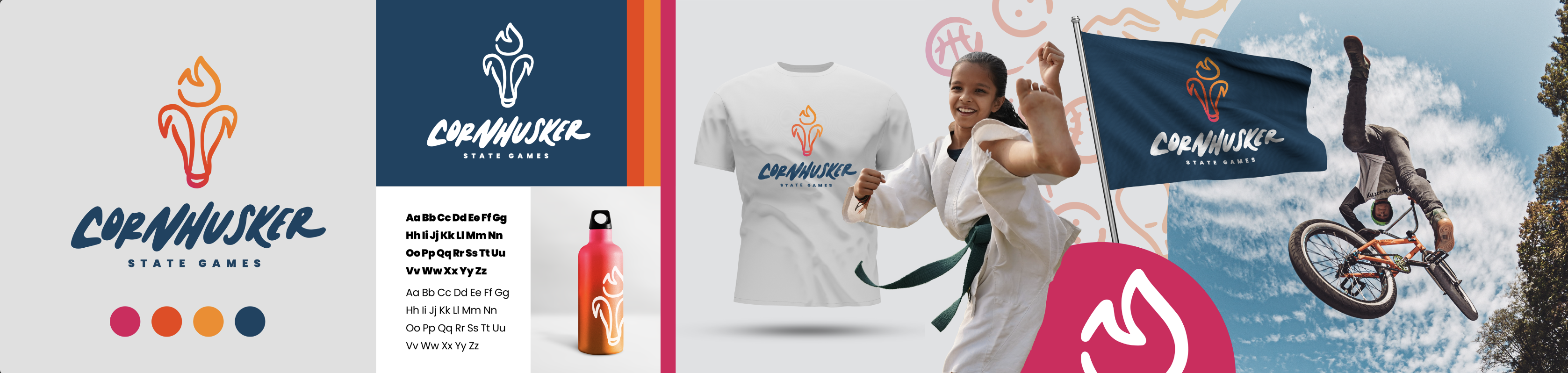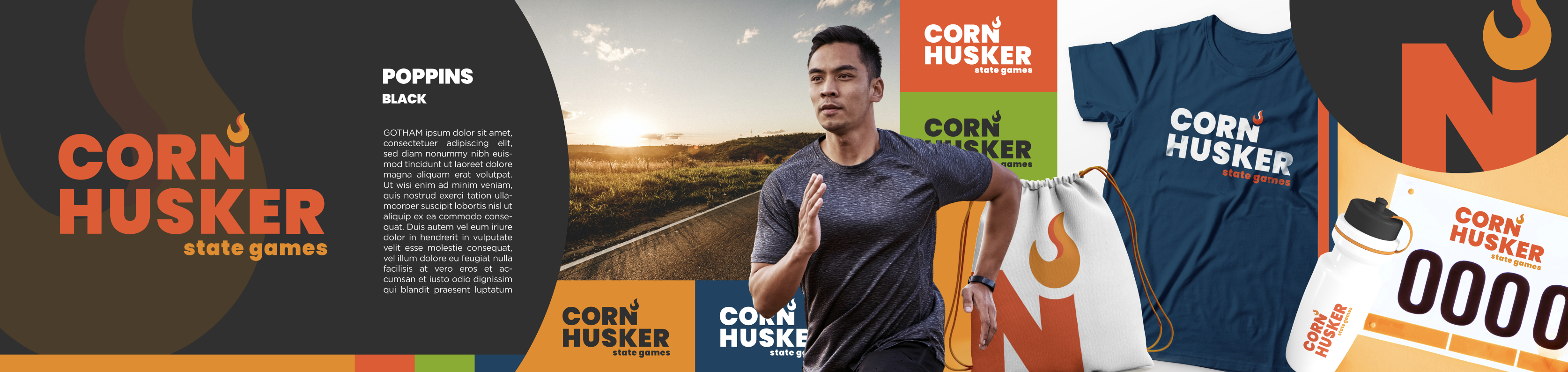 Logo concepts for the Cornhusker State Games, Nebraska’s amateur sports festival. The first concept was selected with adjustments switching the emphasis from ‘cornhusker’ to ‘state games’. This was accompanied by minor adjustments to the chosen typefaces.
