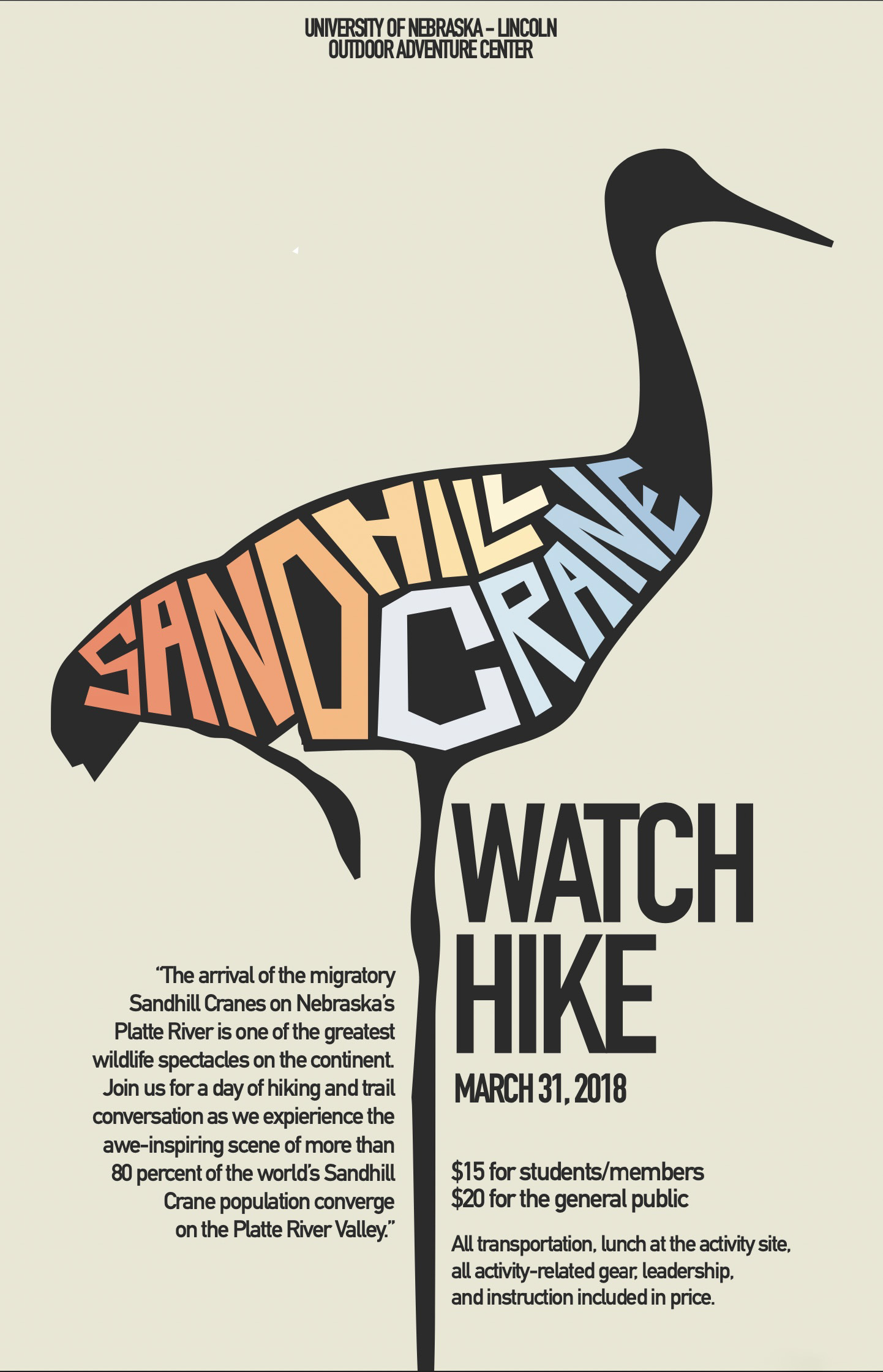 Poster promoting the UNL Outdoor Adventure Center’s annual Sandhill Crane Watch Hike.