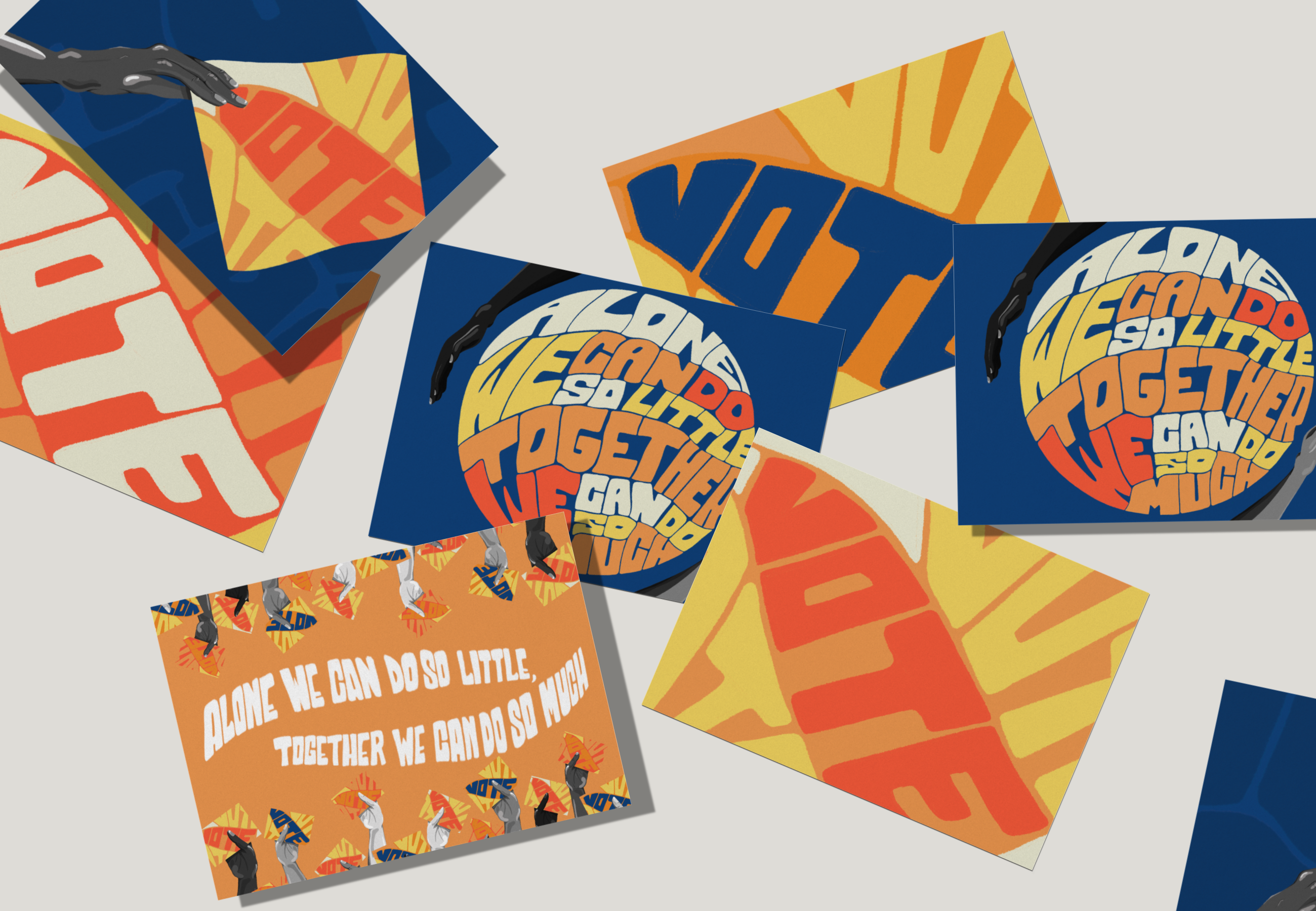 Encouraging people to continue these acts I designed six postcards to emphasize the power of the vote and voice. I connected these ideas to famous quotes crafted with freeform typography, inspired by the 60s and hand illustrations, depiciting the diversity of the population.